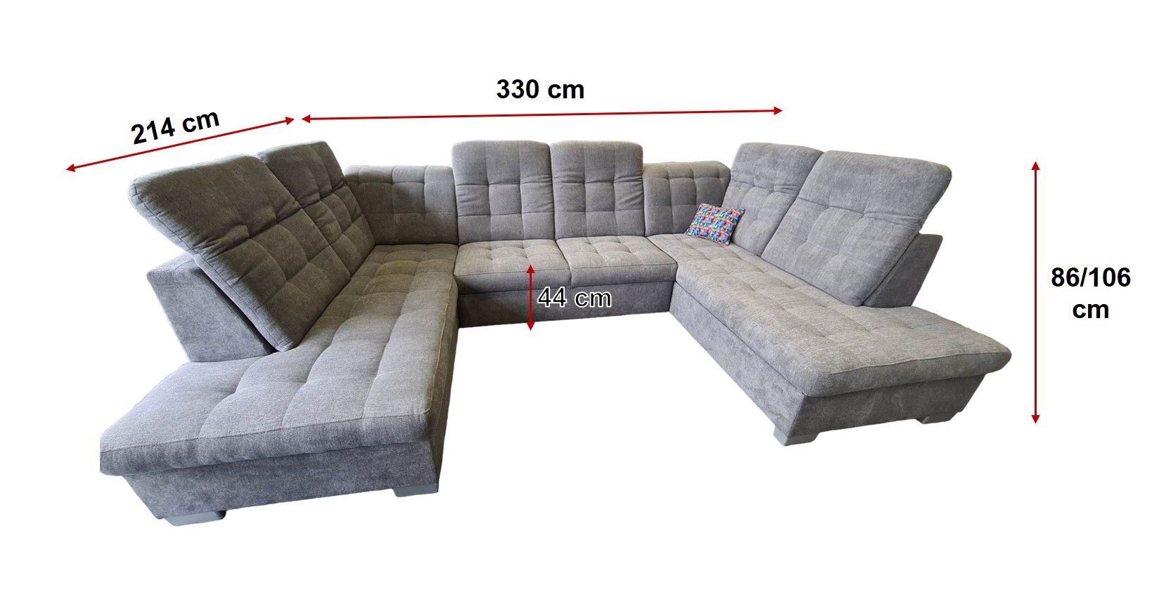 Rozměry: délka 330 cm, šířka 214 cm, výška sedu 44 cm, výška 86/106 cm,