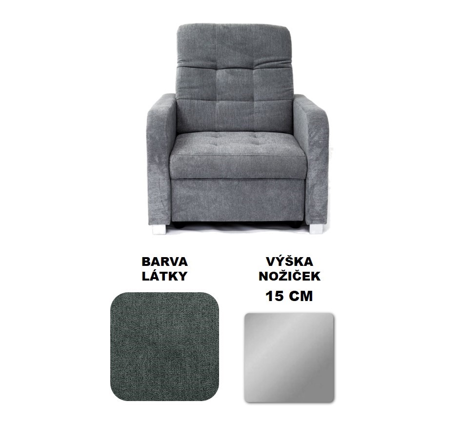 Křeslo má možnost výběru výšky nožiček, 10 cm, 12 cm nebo 15 cm.