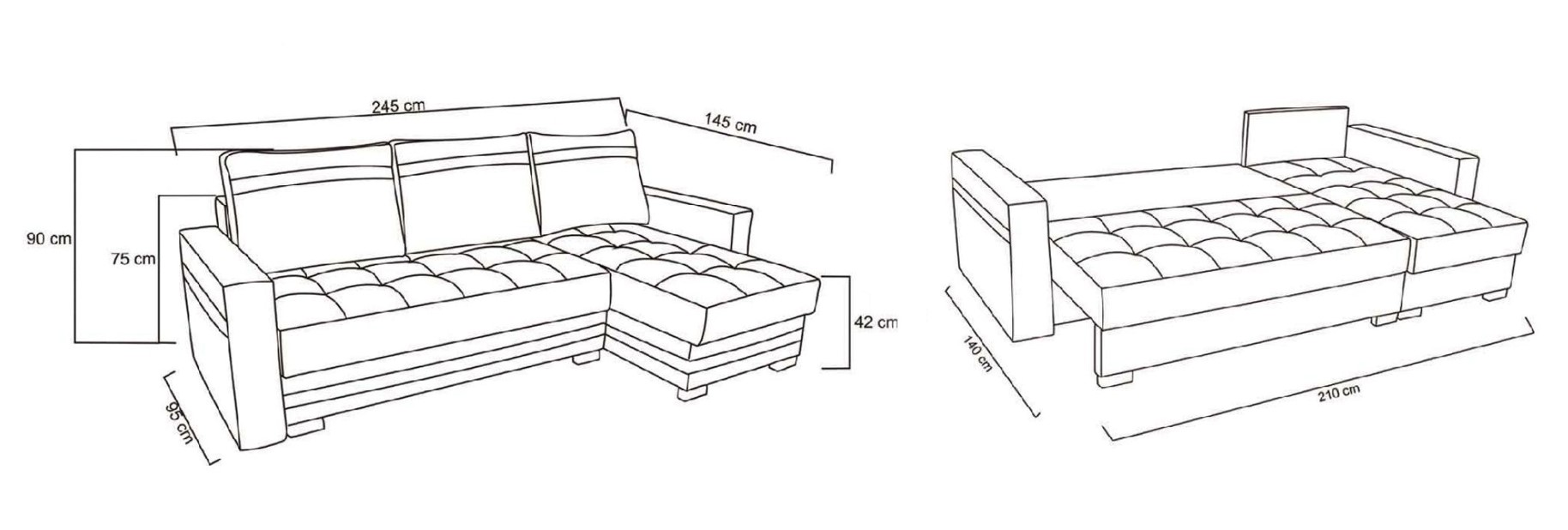 Rozměry: délka 245 cm, šířka 145 cm, výška sedu 42 cm, výška 90 cm, rozklad 210/140 cm.