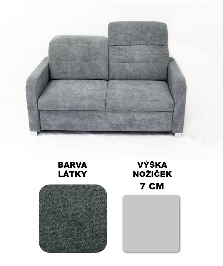 Dvojsedák: délka 160 cm, šířka 93 cm, výška sedu 44 cm, výška 86/106 cm, hloubka sedu 57 cm, výška nožiček 7 cm, 10 cm, 12 cm nebo 15 cm