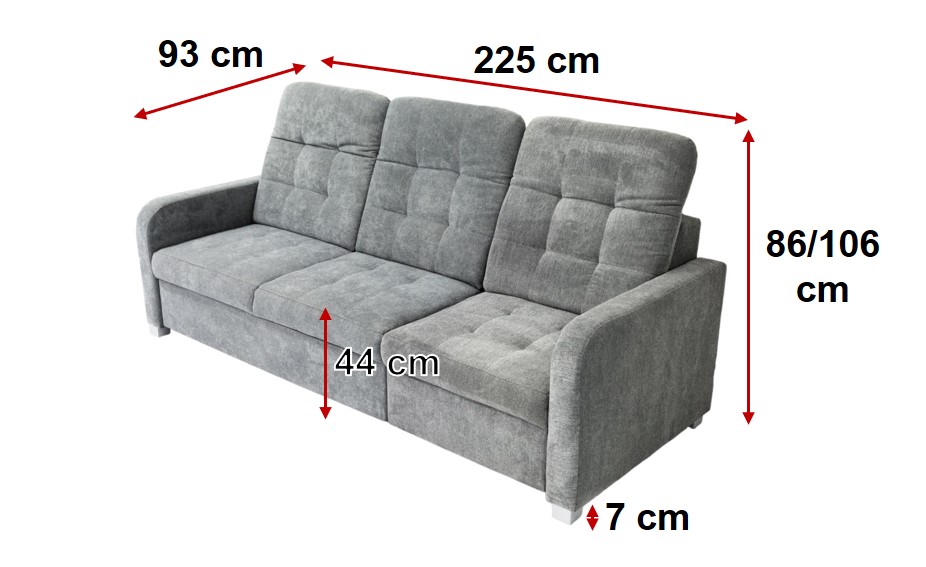 Trojsedák: délka 225 cm, šířka 93 cm, výška sedu 44 cm, výška 86/106 cm, hloubka sedu 57 cm,