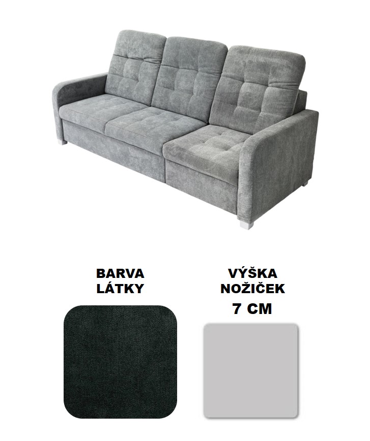 Trojsedák: délka 225 cm, šířka 93 cm, výška sedu 44 cm, výška 86/106 cm, hloubka sedu 57 cm,