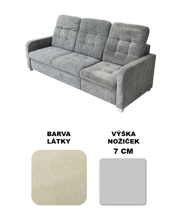 Trojsedák: délka 225 cm, šířka 93 cm, výška sedu 44 cm, výška 86/106 cm, hloubka sedu 57 cm,