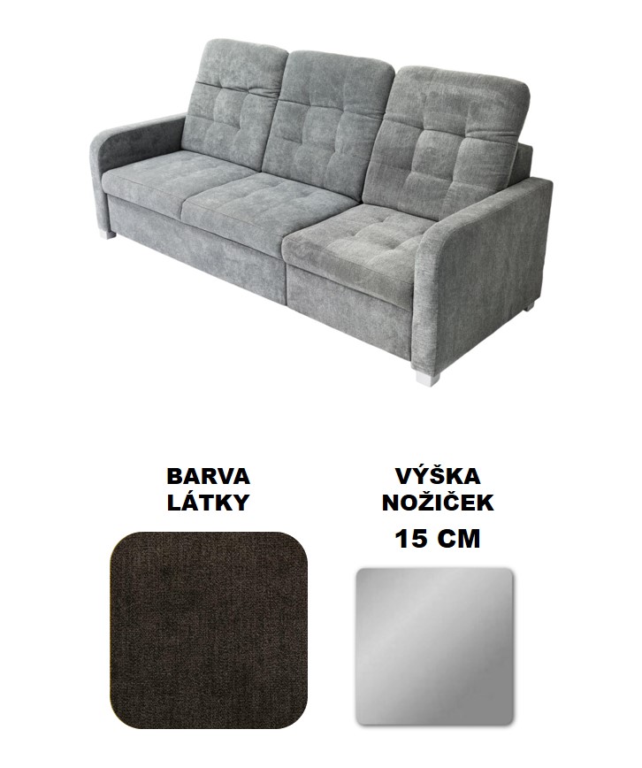 Trojsedák: délka 225 cm, šířka 93 cm, výška sedu 44 cm, výška 86/106 cm, hloubka sedu 57 cm,