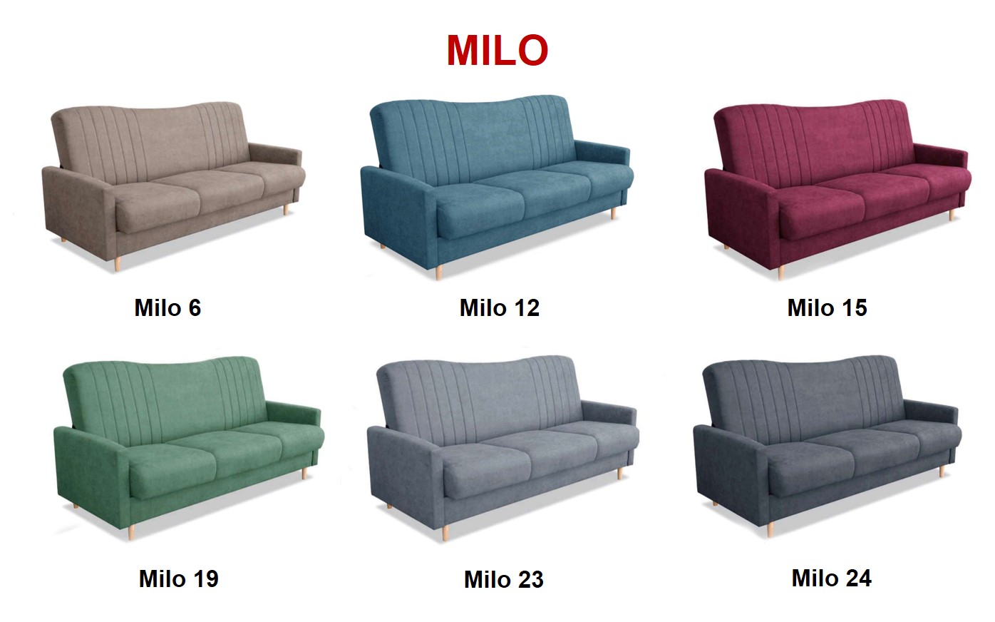 Látka Milo je hladká a příjemná na dotek. Vyznačuje se vlastností tzv. Easy clean – snadné čištění. Vyrobená ze 100% polyesteru, gramáž 406 g/m2, test oděru 60 000 otáček.