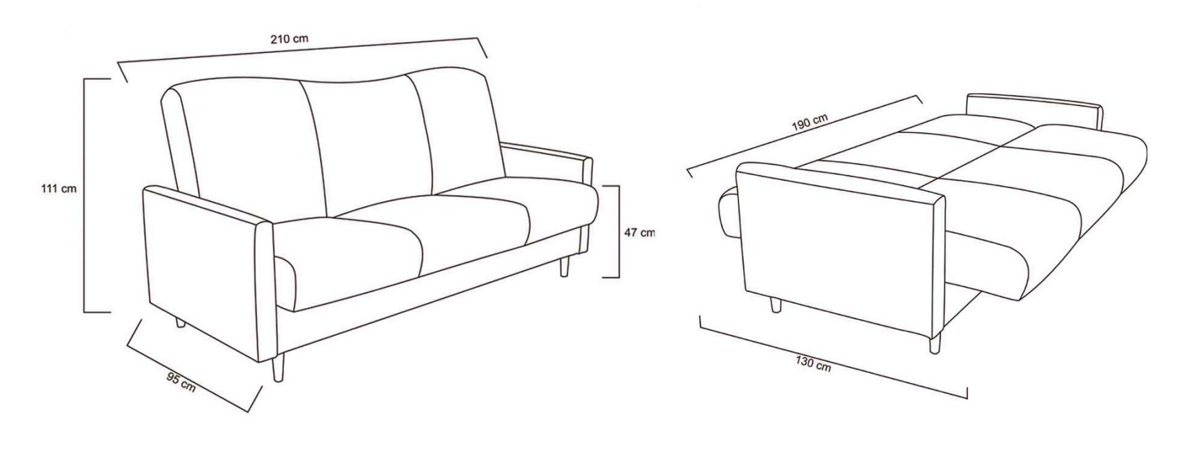 Rozměry: délka 210 cm, šířka 95 cm, výška sedu 47 cm, výška 111 cm, rozklad 190/130 cm