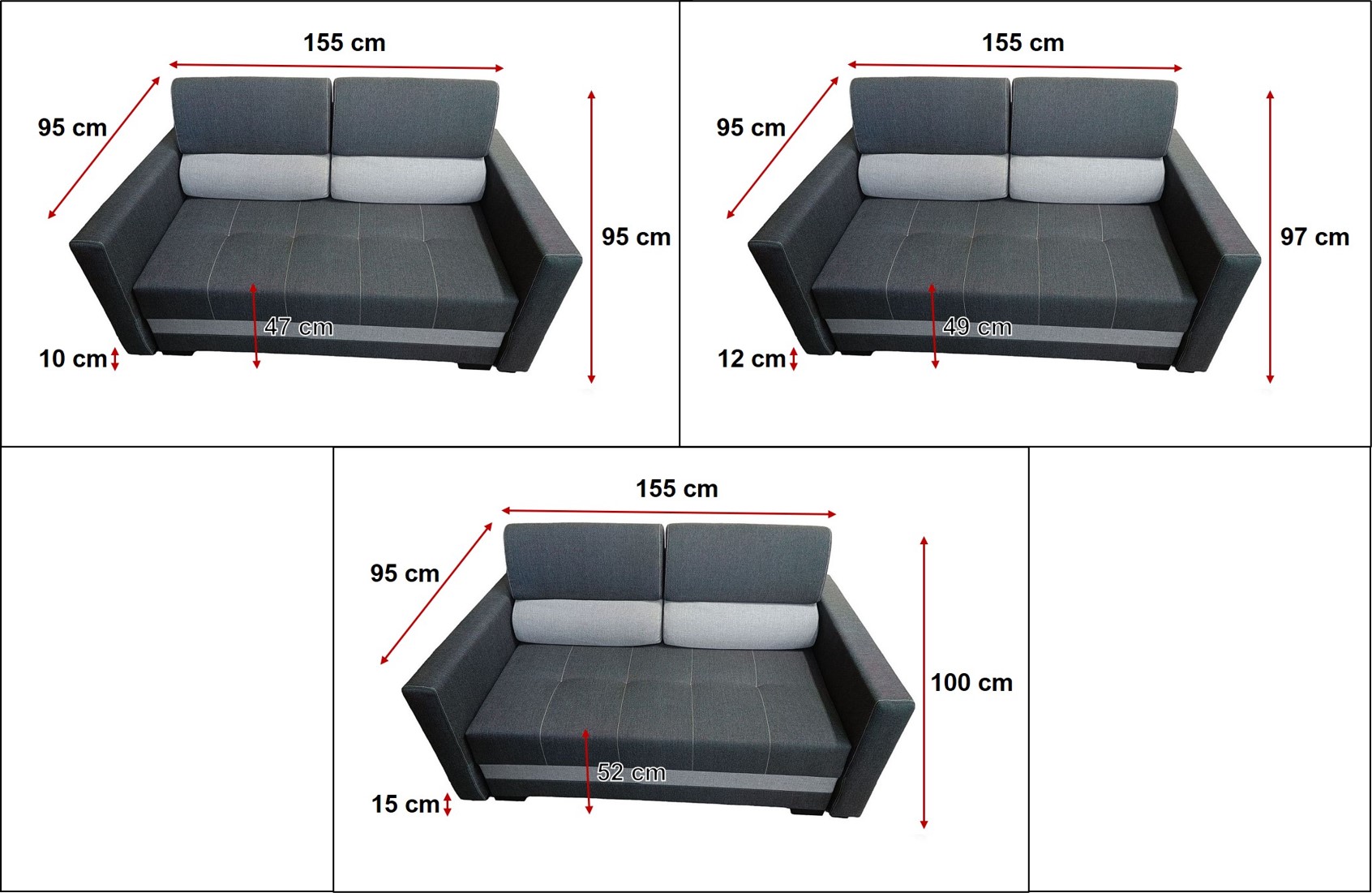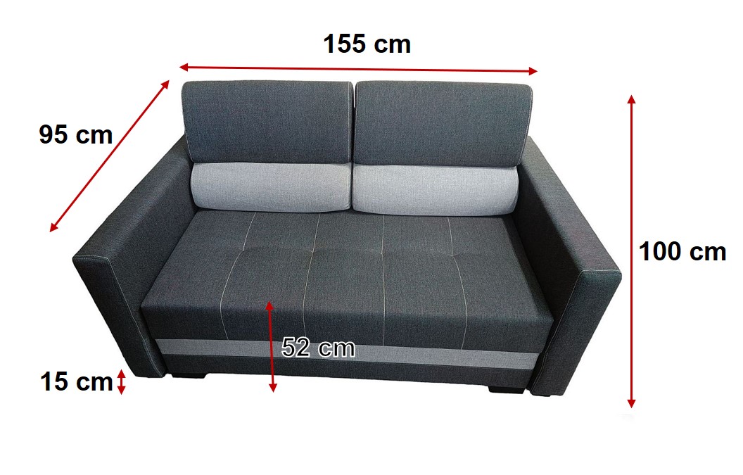 Nohy 15 cm: délka 155 cm, šířka: 95 cm, výška: 100 cm, výška sedu: 52 cm