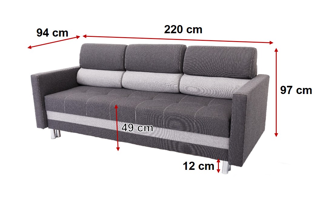 Nohy 12 cm: délka 220 cm, šířka: 94 cm, výška: 97 cm, výška sedu: 49 cm, rozklad: 200/140 cm