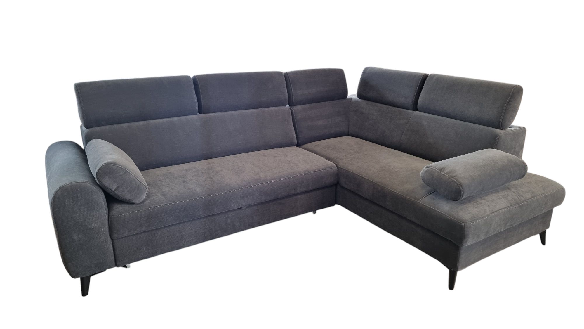 Elegantní rohová sedací souprava Porto II. Moderní design doplňují polohovatelné záhlavníky. Souprava je na vyšších nohách vhodná i pro robotický vysavač. Pohodlné sezení zajistí vysoce elastická HR pěna umístěná na faliste pružinách. Jednoduchý výsuvný rozklad vytvoří lůžko na příležitostné přespání. Praktickým řešením je jeden úložný prostor.
